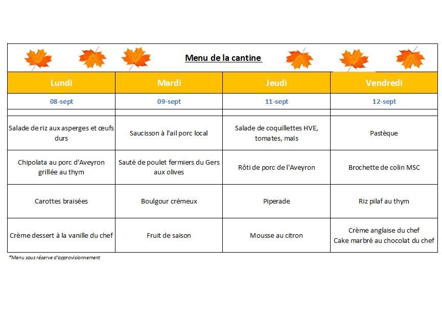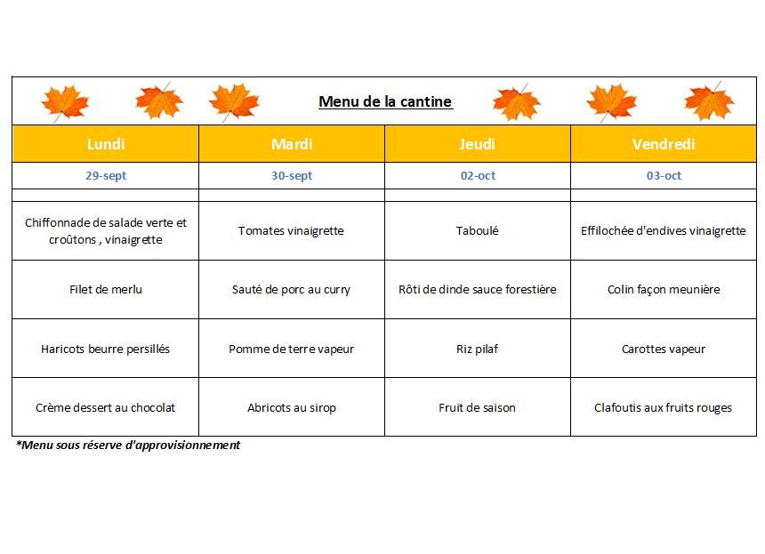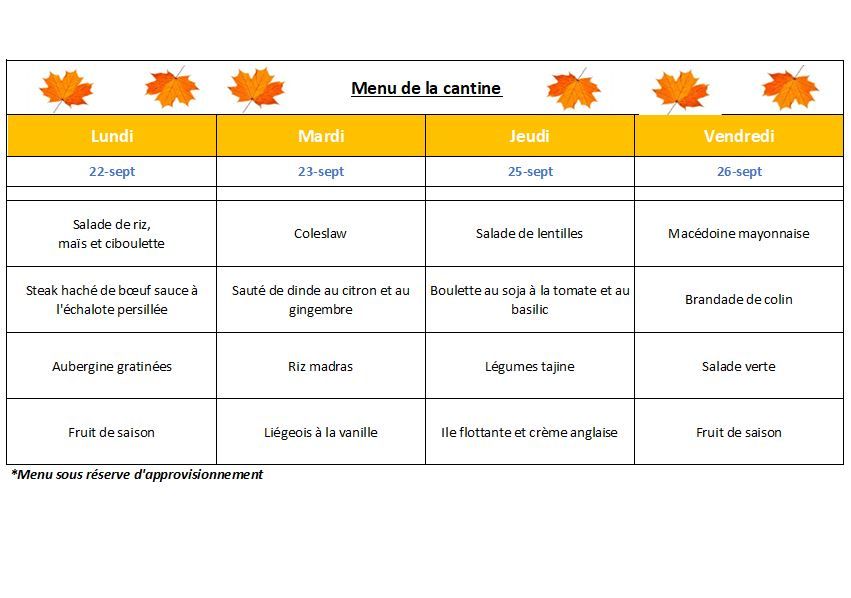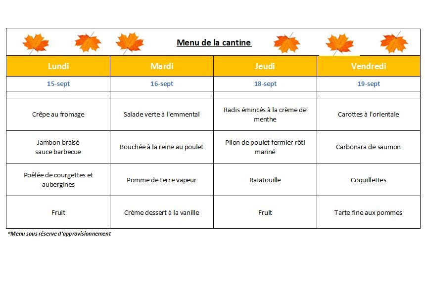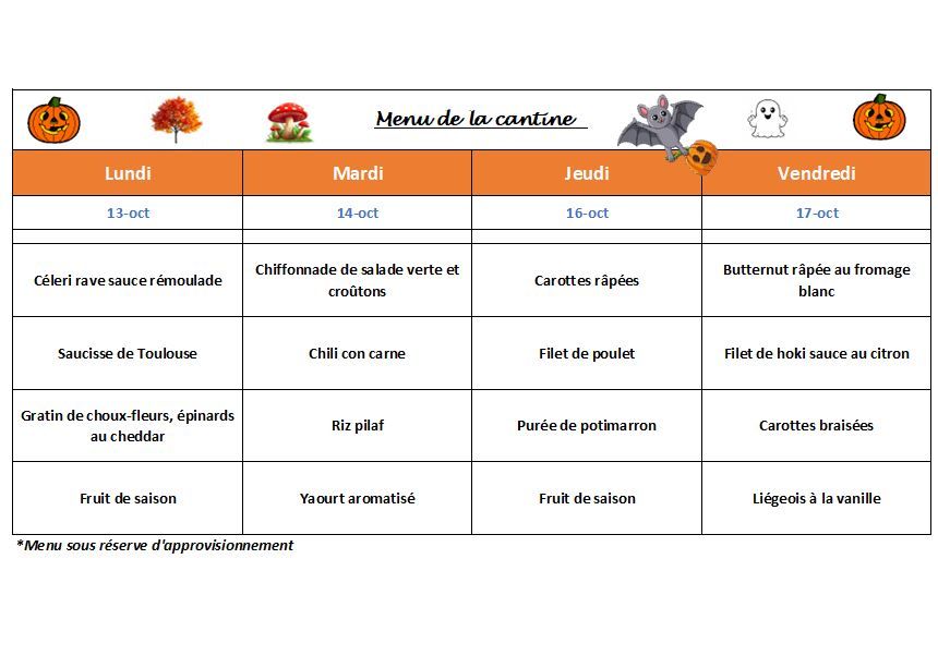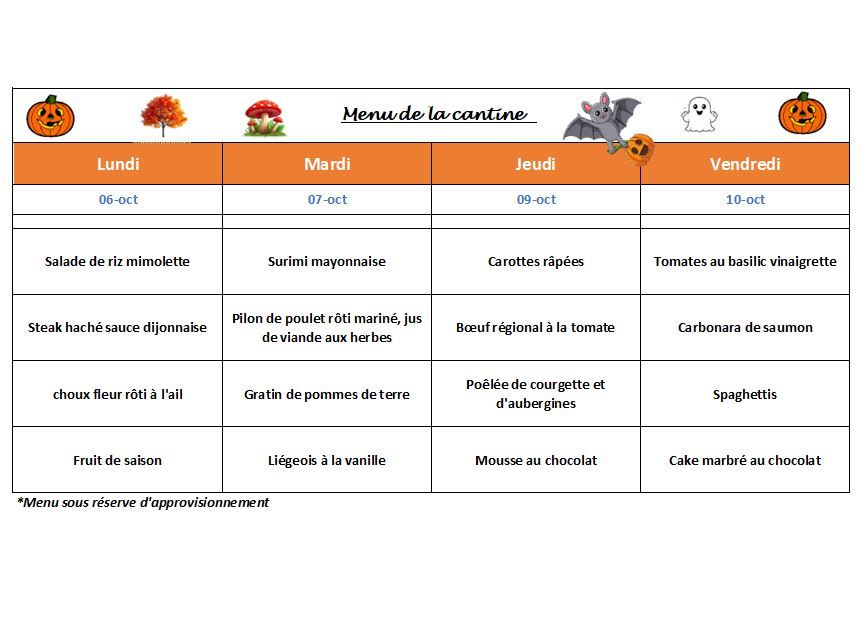 Vous trouverez ici les menus de la cantine. Ils sont ajoutés petit à petit en début de semaine.